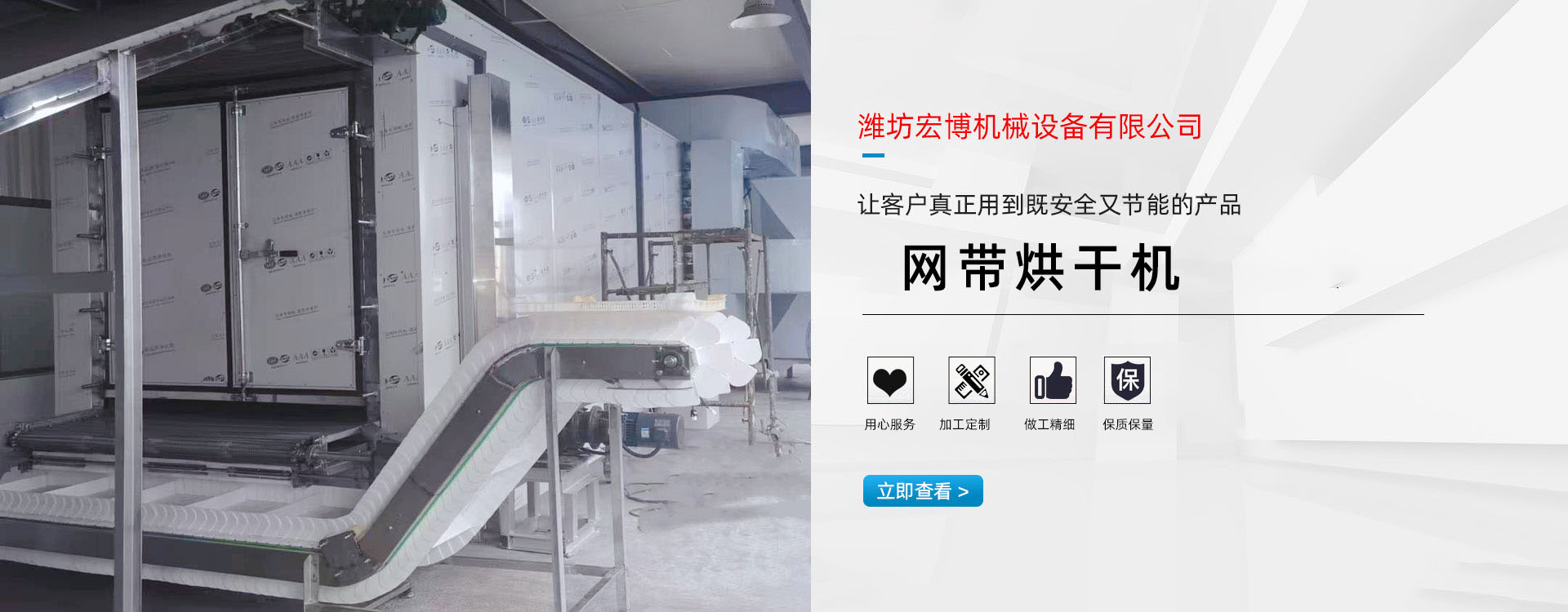 宏博公司主要產(chǎn)(chǎn)品有:網(wǎng)(wǎng)帶烘干機(jī)、食品烘干機(jī)、滾筒烘干機(jī)、隧道窯、烘干箱、燃?xì)鉄犸L(fēng)爐、高大車間供暖設(shè)(shè)備、礦用防爆電加熱器等。