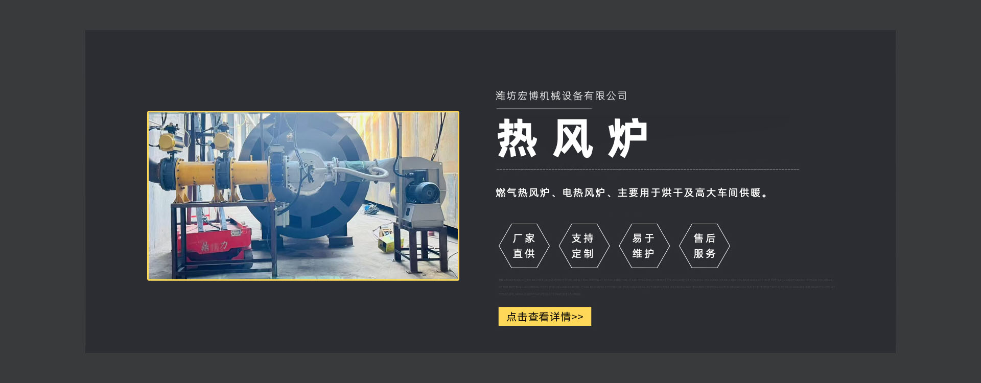 濰坊宏博機(jī)械設(shè)(shè)備有限公司是從事熱風(fēng)爐、烘干設(shè)(shè)備、供暖設(shè)(shè)備的研發(fā)(fā)、設(shè)(shè)計(jì)、制造和服務(wù)于一體的實(shí)體企業(yè)(yè)。長(zhǎng)期以來,企業(yè)(yè)以市場(chǎng)的發(fā)(fā)展和客戶的需求為導(dǎo)向,集多年的生產(chǎn)(chǎn)技術(shù)(shù)與經(jīng)(jīng)驗(yàn)為一體,不斷開發(fā)(fā)和優(yōu)(yōu)良產(chǎn)(chǎn)品。